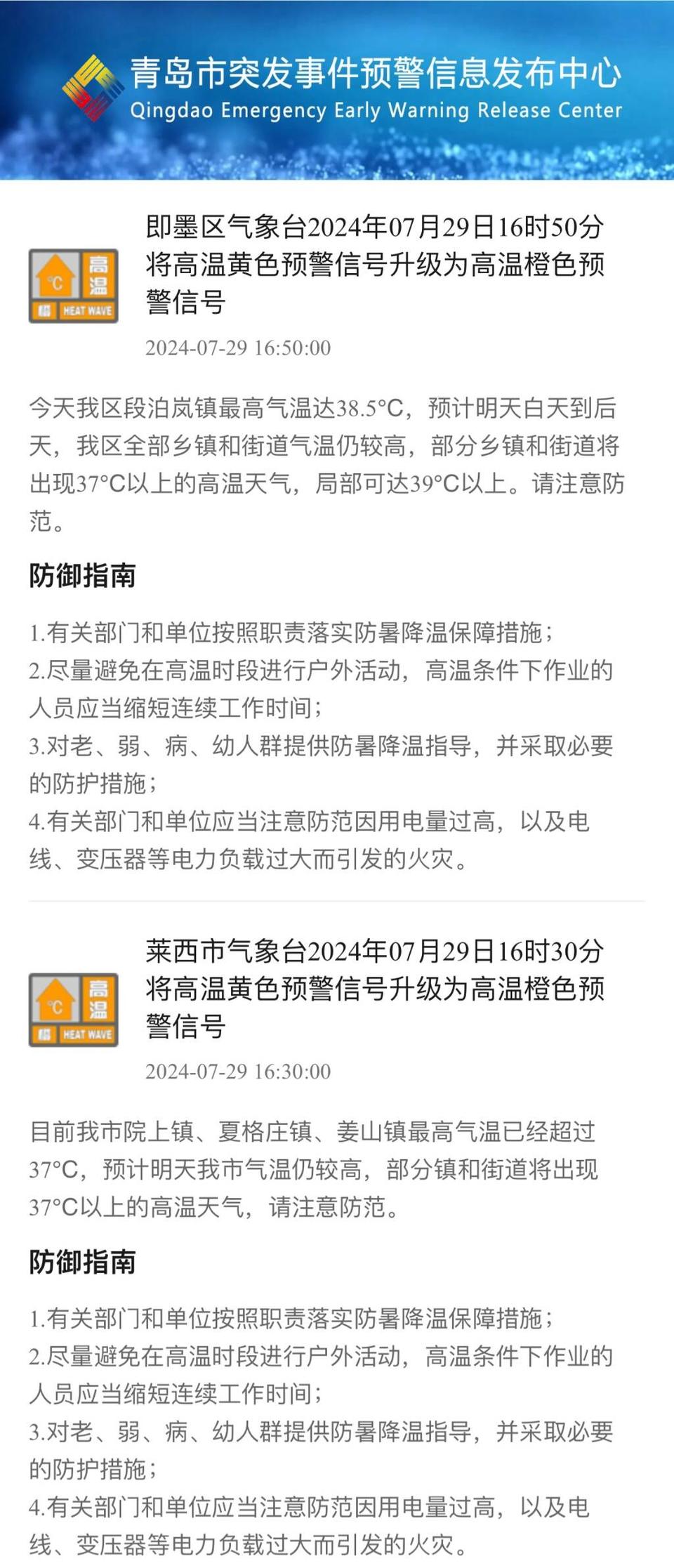7月29日16时30分,莱西市气象台将高温黄色预警信号升级为高温橙色预警信号,莱西市院上镇、夏格庄镇、姜山镇最高气温已经超过37℃,预计30日莱西市气温仍较高,部分镇和街道将出现37℃以上的高温天气。16时50分,即墨区气象台也将高温黄色预警信号升级为高温橙色预警信号,29日即墨区段泊岚镇最高气温达38.5℃,预计30日白天到后天,即墨区全部乡镇和街道气温仍较高,部分乡镇和街道将出现37℃以上的高温天气,局部可达39℃以上。