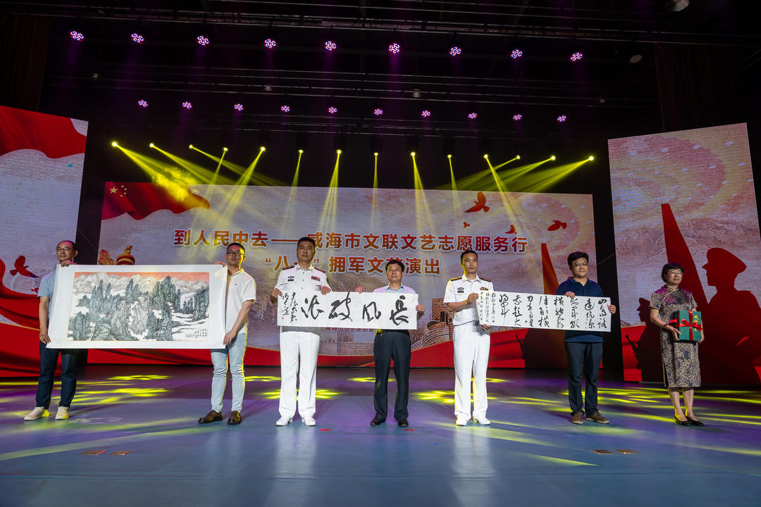 演出现场,威海市文联、市文学艺术创作研究院、市书法家协会向部队官兵分别赠送了图书和书画作品。
