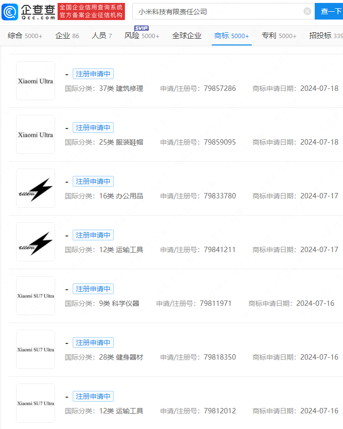 企查查APP显示,近日,小米科技有限责任公司申请多枚“Xiaomi SU7 Ultra”“Xiaomi Ultra”文字商标以及“Ultra”相关图形商标,国际分类包括运输工具、健身器材、科学仪器等,当前商标状态均为注册申请中。