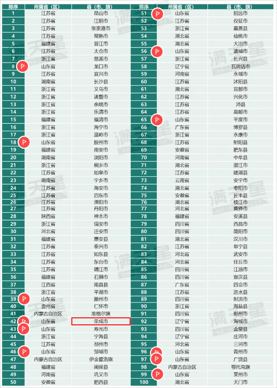 7月31日举办的2024县域经济创新发展论坛上,赛迪顾问对外发布2024中国县域经济百强县,山东共有12地入选,分别是:龙口市(8)、胶州市(18)、滕州市(39)、荣成市(42)、寿光市(43)、邹城市(46)、招远市(51)、诸城市(56)、平度市(65)、青州市(96)、广饶县(97)、莱州市(99)。