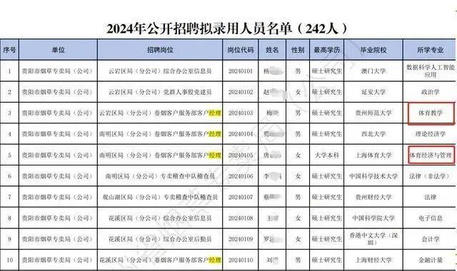 而7月22日贵州省烟草专卖局(公司)发布的2024年公开招聘拟录用人员公示显示,云岩区局(分公司)卷烟客户服务部客户经理一职,拟录用人员为梅某,男,硕士学历,毕业于贵州师范大学体育教学专业;南明区局(分公司)卷烟客户服务部客户经理一职,拟录用唐某,女,本科学历,上海体育大学体育经济与管理专业。