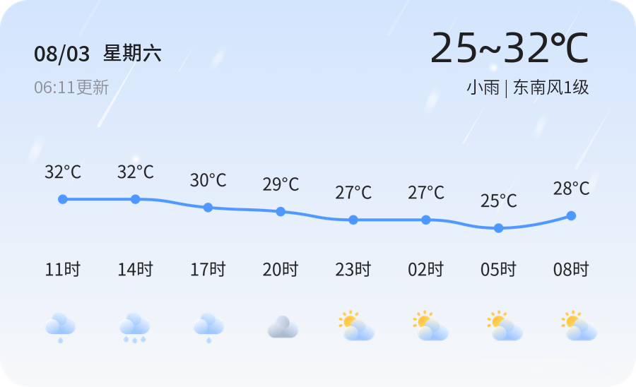 今天是2024年8月3日,农历六月廿九,菏泽市迎来小雨天气,东南风1级,气温在25℃至32℃之间,相对湿度高达92%,空气质量优(PM2.5值为25,空气质量等级为一级优),适宜市民户外活动,但请携带雨具以防不测。出行时请注意防滑,行车时请谨慎驾驶,确保安全。