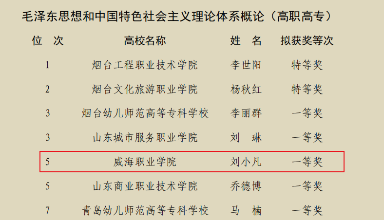 近日,山东省教育厅公布了《第三届全省学校思想政治理论课教学比赛获奖人员名单》,威海职业学院马克思主义学院薛云喜、刘小凡两位教师,凭借扎实的理论功底、高超的教学水平、出色的比赛表现,分别荣获高职高专组《习近平新时代中国特色社会主义思想概论》课程和《毛泽东思想和中国特色社会主义理论体系概论》课程一等奖,创下学校参加此类比赛的历史最佳纪录。