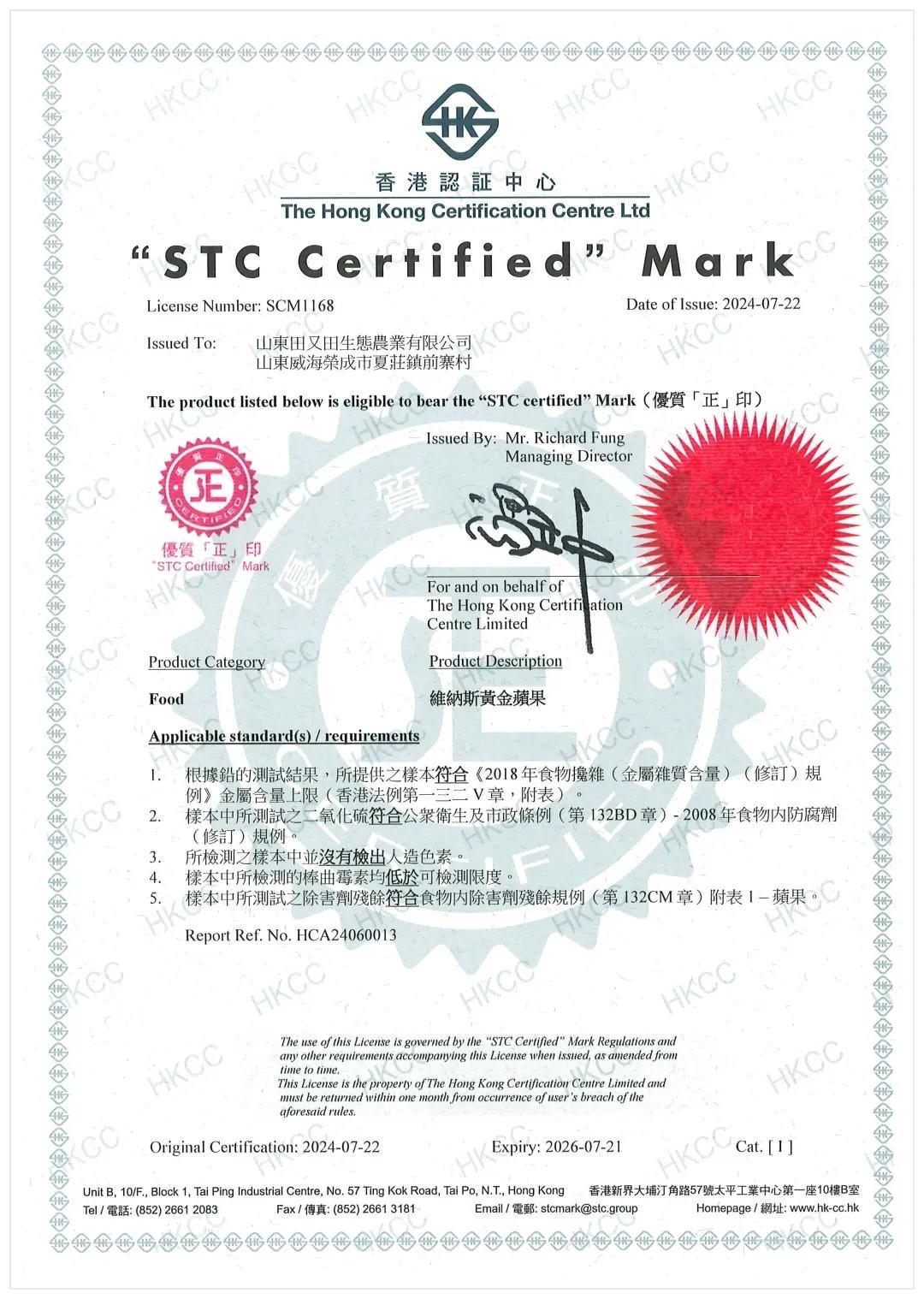 优质“正”印认证是香港标准及检定中心开展的高端产品认证,是香港市场上最受欢迎的产品认证标志之一,拥有优质“正”印认证即表明该产品已满足进入香港市场品质要求。位于荣成市夏庄镇的山东田又田生态农业有限公司,凭借基地化种植、标准化生产等优势,其出产的维纳斯黄金苹果顺利通过了香港标准及检定中心100多项指标的严格检测,最终顺利拿到了认证证书。“下一步,我们将围绕苹果深加工做文章,争取让果干、果汁等产品同样打开香港市场。”公司总经理张黎军说。