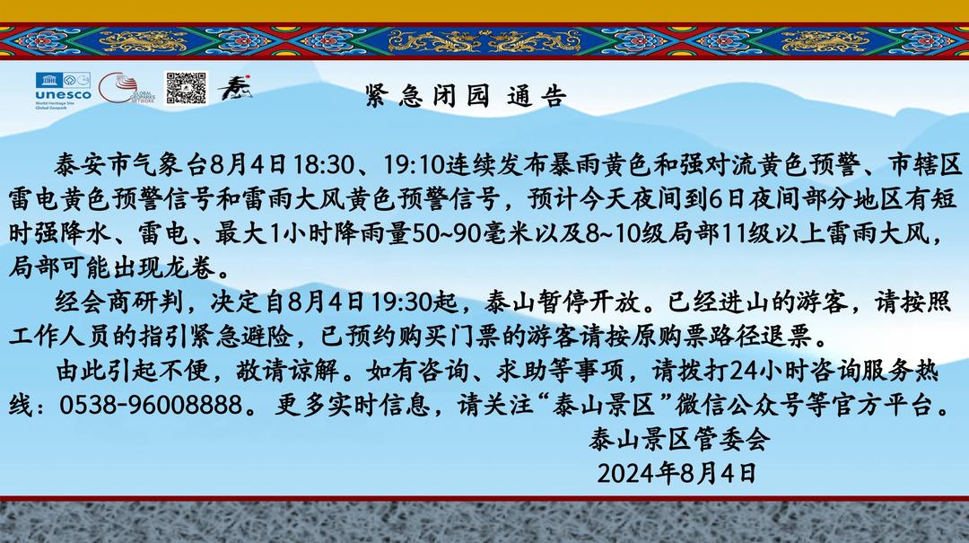 经会商研判分析,8月4日夜到6日,泰山盘道、旅游公路、山顶观景平台等或将出现较大范围的积水、大风、雷电等现象,存在极大安全隐患,为切实保障中外游客的安全与健康,决定自8月4日19:30起,泰山景区各游览线路暂停开放,恢复开放时间另行通告。