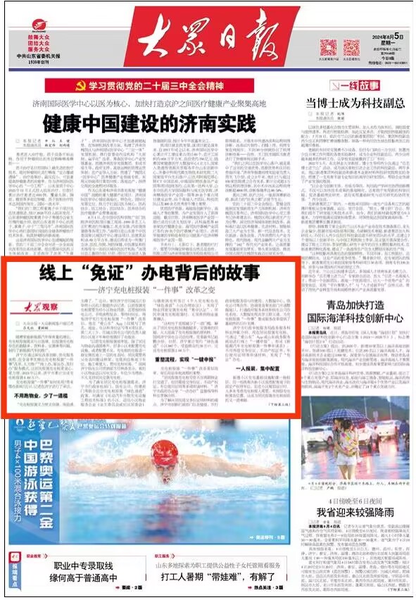 8月5日,大众日报头版以《线上“免证”办电背后的故事——济宁充电桩报装“一件事”改革之变》为题,对济宁在全省率先推出充电桩报装“一件事”改革进行了重点报道。