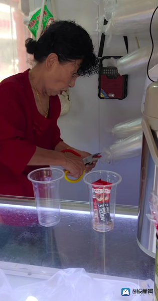 不久前, 韩阿姨十元手冲咖啡的视频在网络爆火。视频中,她当着顾客的面将三条速溶咖啡剪开,倒入杯中,再用暖瓶中的热水冲泡,调制成一杯“手冲”咖啡,售价10元。这杯量足、质朴的咖啡让网友趋之若鹜,韩阿姨的店成了网红店,每天几百人排队“打卡”。