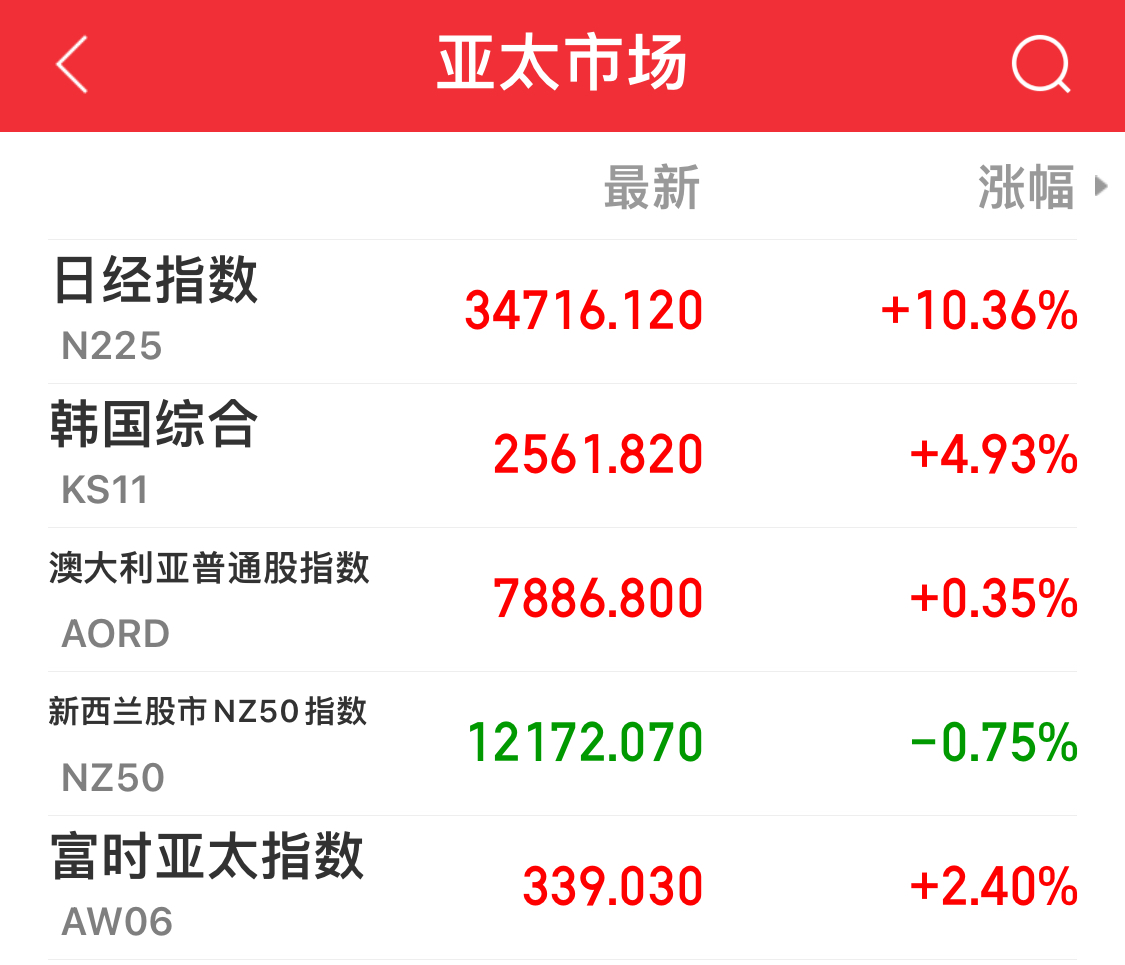 北京时间8:30分左右,日本重磅权重股也集体大涨,东京电子涨超14%,日立涨近14%,三菱日联金融涨超12%,丰田汽车涨超10%;8:50分,日经225指数涨超10%。