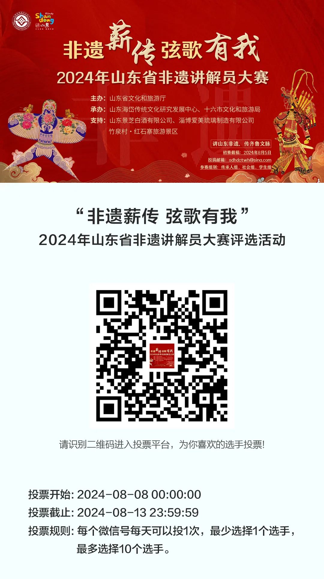 由山东省文化和旅游厅主办、山东海岱传统文化研究发展中心承办的“非遗薪传 弦歌有我”——2024年山东省非遗讲解员大赛作品展示环节于2024年8月7日正式结束,2024年8月8日0:00起,正式进入网络投票阶段,网络投票截止时间为8月13日24:00。
