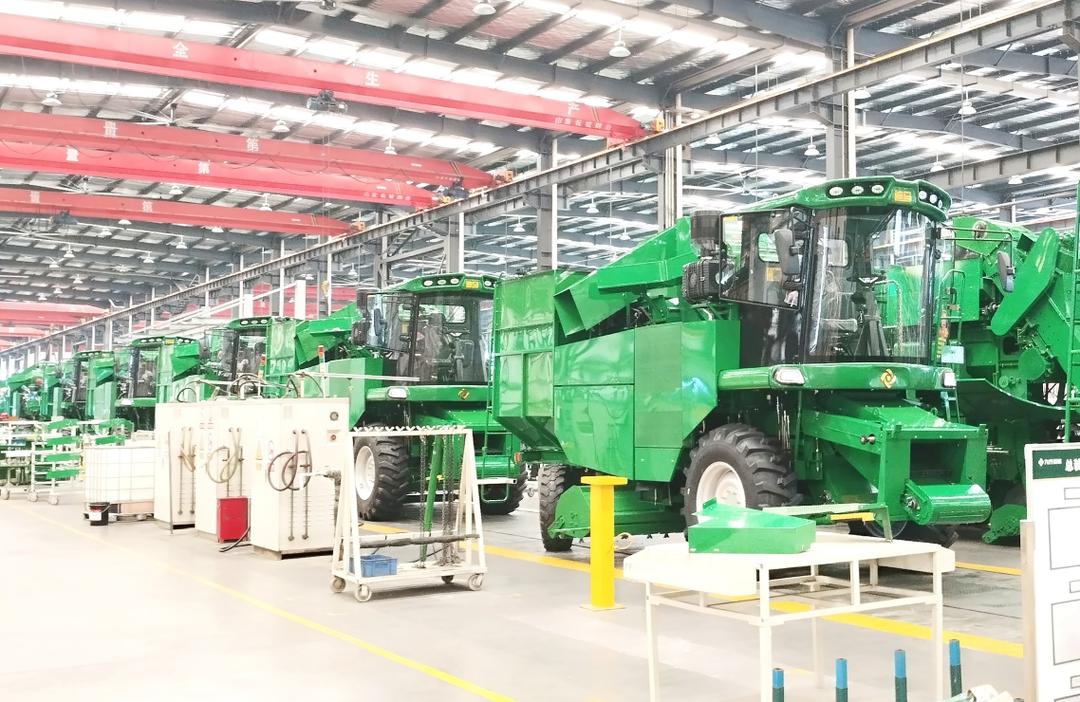 在九方泰禾国际重工(青岛)股份有限公司车间内,新型农机设备排列整齐,轰隆隆的农机装配声响彻整个车间,工人们正紧张有序作业,另一边,技术人员拿着专业设备对即将下线的产品进行检测。