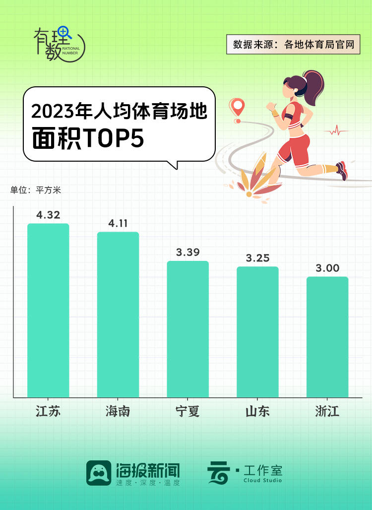 2023年,我国体育场地面积40.71亿平方米,全国人均体育场地面积2.89平方米。其中江苏以4.32平方米居首,海南4.11米次之。宁夏、山东、浙江则是剩余的其他“破三”省份。