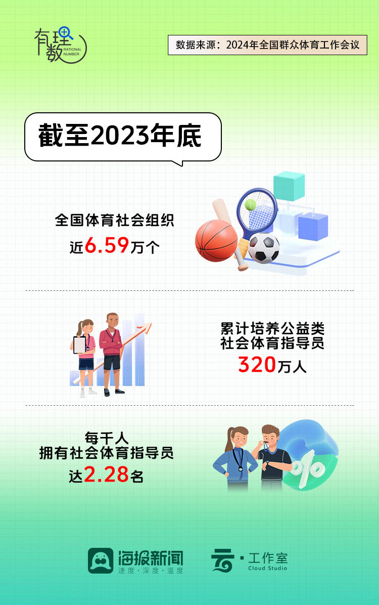 截至2023年底,全国体育社会组织近6.59万个,累计培养公益类社会体育指导员320万人,新培养了超5万名农村女性社会体育指导员,每千人拥有社会体育指导员达2.28名,提前达成了《“十四五”体育发展规划》中提出的每千人拥有社会体育指导员2.16名的目标。