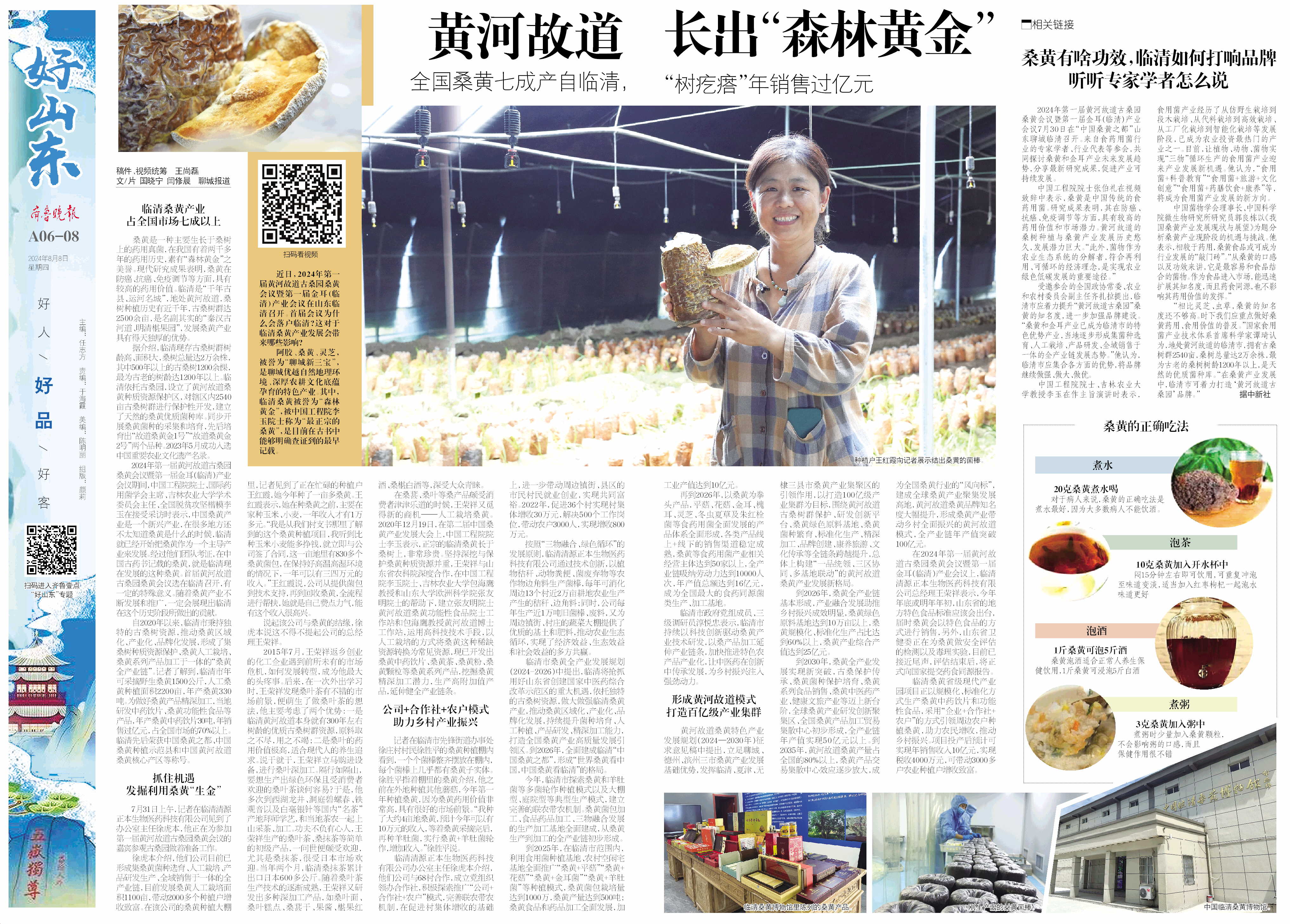自2020年以来,临清市秉持独特的古桑树资源,推动桑黄区域化、产业化、品牌化发展,形成了集桑树种质资源保护、桑黄人工栽培、桑黄系列产品加工于一体的“桑黄全产业链”。记者了解到,临清市年可采摘野生桑黄1500公斤,人工桑黄种植面积2200亩,年产桑黄330吨。为做好桑黄产品精深加工,当地研发中药饮片、桑黄功能性食品等产品,年产桑黄中药饮片30吨,年销售过亿元,占全国市场的70%以上。临清先后荣获中国桑黄之都、中国桑黄种植示范县和中国黄河故道桑黄核心产区等称号。