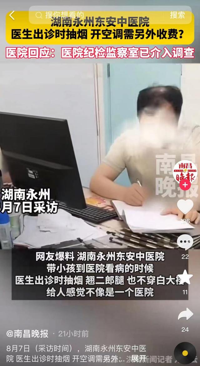 医院回应“医生诊疗时打电话抽烟”:已对涉事医生罚款扣分