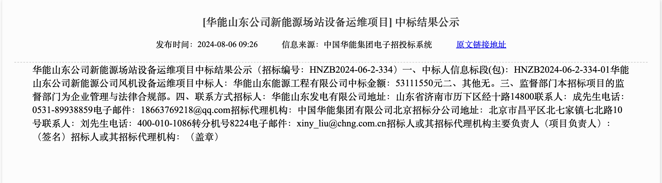 来自中国华能集团电子商务平台的信息显示,华能山东公司新能源场站设备运维项目中标结果公示(招标编号:HNZB2024-06-2-334)。