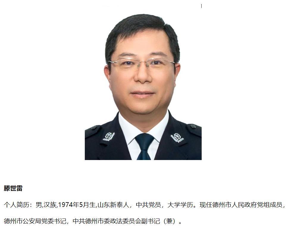 近日,德州市公安局网站更新领导信息,滕世雷已任德州市人民政府党组成员,德州市公安局党委书记,中共德州市委政法委员会副书记(兼)。
