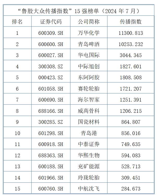 具体来看,“鲁股大众传播指数”(2024年7月)15强榜单前三名依次是万华化学、青岛啤酒、华电国际(600027.SH),紧随其后的是中际旭创(300308.SZ)和东阿阿胶(000423.SZ),第六至十五名依次是赛轮轮胎、海尔智家(600690.SH)、威高骨科(688166.SH)、国瓷材料(300285.SZ)、青岛港(601298.SH)、中泰证券(600918.SH)、华熙生物(688363.SH)、兖矿能源(600188.SH)、玲珑轮胎(601966.SH)、中航沈飞(600760.SH)。