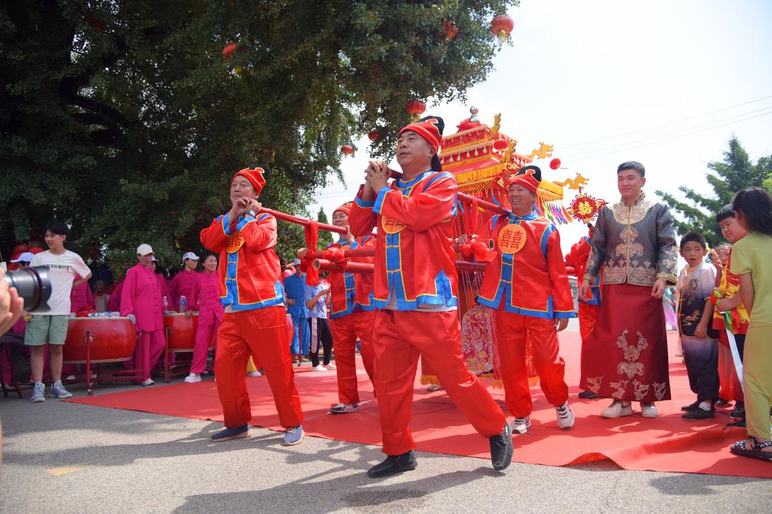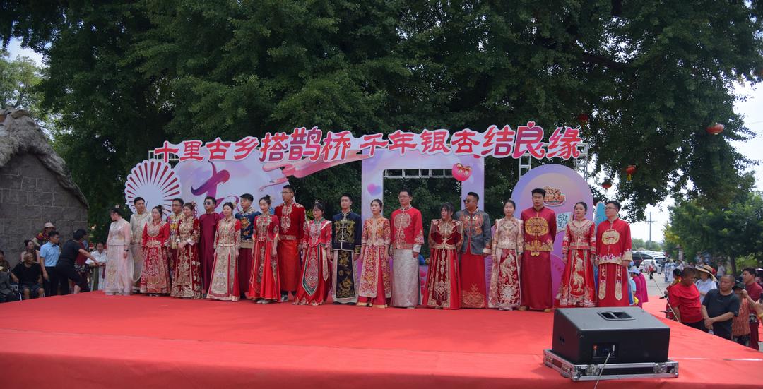8月9日,在荣成市宁津街道渠隔村,硕大的千年古银杏树下,又一次热闹起来。“十里古乡搭鹊桥 千年银杏结良缘”活动的举办,给村民们带来了一场文化盛宴,该活动也是山东省“七夕”主题示范活动之一。热闹的石岛渔家大鼓和舞狮表演,“点燃”现场气氛,10对身着秀禾服的新人齐登台,在千年银杏树旁,许下对彼此的诺言,完成了简约而温馨的集体婚礼。