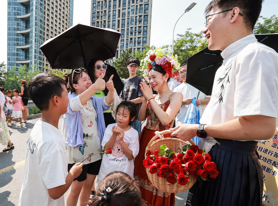 在网红打卡地火炬八街,高区新时代文明实践中心组织的七夕系列主题活动,为这里增添了节日气氛和传统文化韵味。为情侣拍摄秦汉服饰照片、情侣心有灵犀互动答题赢七夕果、“七夕脱单”落日音乐派对……一系列活动受到游客和市民的喜爱。