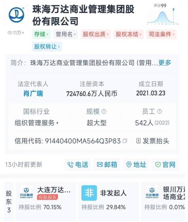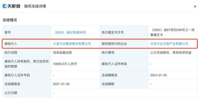 8月12日,天眼查法律诉讼信息显示,近日,大连万达集团股份有限公司(以下简称“万达集团”)新增一则股权冻结信息,股权被执行的企业为北京万达文旅产业有限公司,冻结股权数额为1亿元,冻结期限自2024年7月30日至2027年7月29日,执行法院为成渝金融法院。