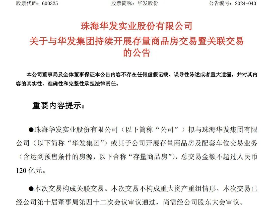 珠海市近日披露了一则金额逾百亿的存量商品房收购信息。珠海华发实业股份有限公司公告称,拟与该公司控股股东珠海华发集团有限公司或其子公司开展存量商品房及配套车位交易业务,总交易金额不超过120亿元。