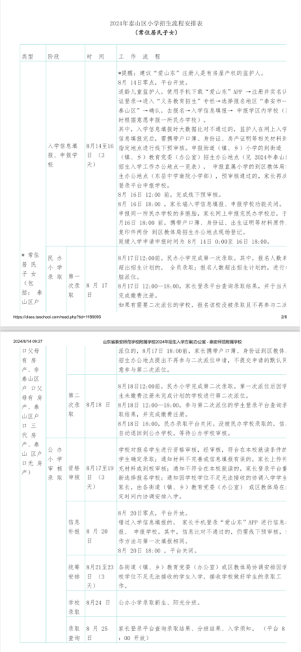 (3)报名流程:提交相关证明表格(表格在泰山区人民政府网站或泰山区教体局微信公众号“泰山杏坛”下载)手机下载“爱山东”APP→注册并实名认证登录→进入“义务教育招生”专栏→选择报名地区“泰安市—泰山区”→确认,去报名→入学信息填报→申报公办学校,同时根据意愿申报一所民办学校。协调安排入学→录取新生→阳光分班→发放《新生入学通知书》→新生报到。