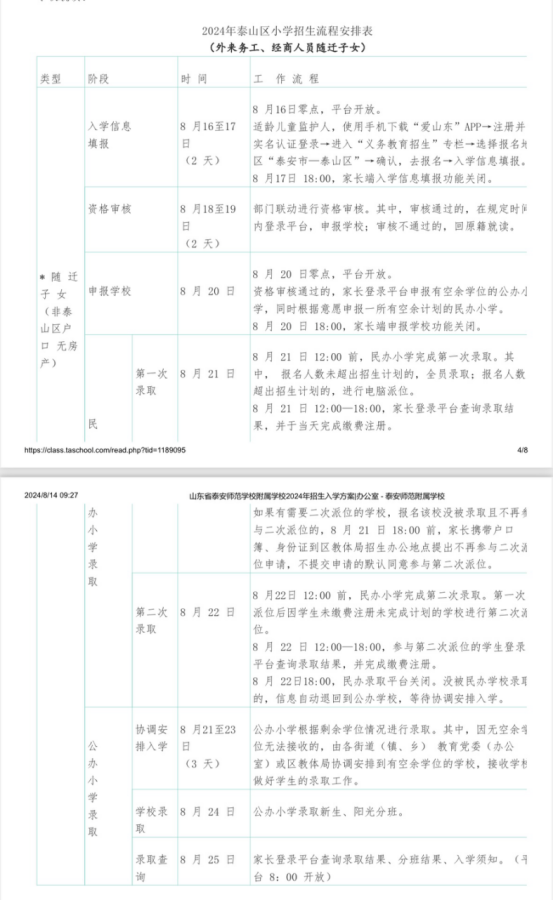 (3)报名流程:手机下载“爱山东”APP→注册并实名认证登录→进入“义务教育招生”专栏→选择报名地区“泰安市—泰山区”→确认,去报名→入学信息填报→随迁子女入学报名信息比对审查→符合条件的随迁子女根据居住证地址(备案的房屋租赁地址)登录平台申报有空余学位的公办学校(同时根据意愿申报有剩余计划的民办学校)→公办学校根据随迁子女监护人居住证、社保、经商纳税时间长短,按空余学位情况依次录取至满额→录取新生→阳光分班→发放《新生入学通知书》→新生报到。