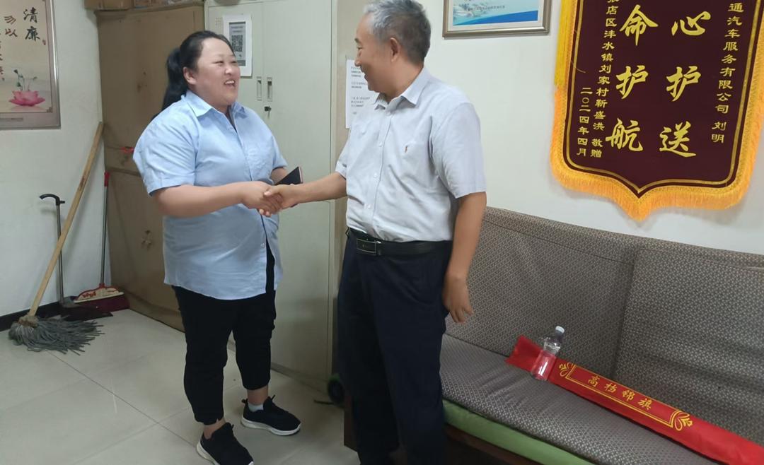 老人康复出院后念念不忘朱师傅的热心相助,根据车号找到了恒通出租公司四分公司。应老人诚挚之邀,公司工作人员将朱秀英师傅叫到公司与老人相见。柴大爷见到朱师傅时,激动的握着她的手说:“小朱啊,多亏了你的热心救助,我和我的家人都非常地感谢你。你是当代的巾帼英雄,女中豪杰啊”,并将带来的一面绣有“助人为乐新风尚、热心帮助献真情”的锦旗交到了朱师傅的手中,朱秀英也激动地表示:“谢谢朱大爷的鼓励,这些都是应该做的,谁家都有老人,都有需要帮助的时候,今后遇见此类事情我还会义无反顾地去做好”。