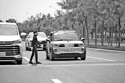 2024世界智能驾驶挑战赛日前在天津举行,图为参赛车辆对过街模拟行人进行制动性能检测。新华社发