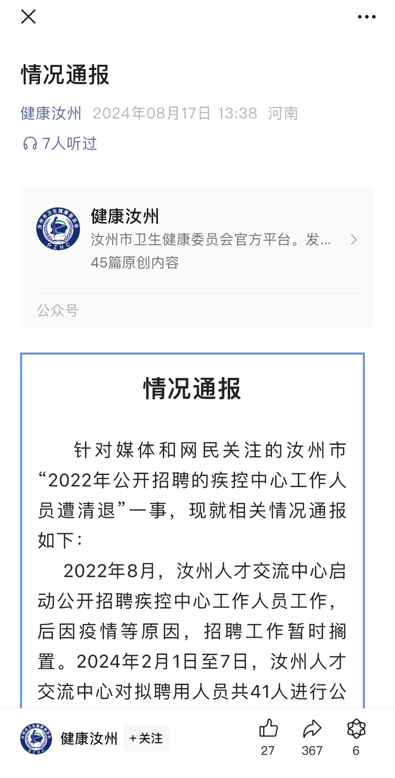 8月16日,海报新闻报道了河南省汝州市疾控中心41名公开招聘人员遭到口头清退一事,引发舆论关注。