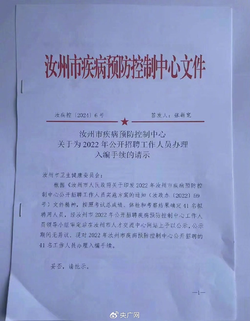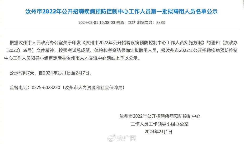 据介绍,今年2月26日,王女士等13名社会应聘者接到汝州市人才交流中心通知后,入职汝州市疾控中心,并通过了3个月的试用期。目前,汝州市人才交流中心(该中心隶属于汝州市人力资源和社会保障局)官网,仍可查询到这41名应聘者的公示名单。