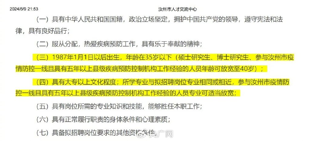 记者查询到,2022年8月29日,汝州市人才交流中心官网发布《汝州市2022年公开招聘疾病预防控制中心工作人员公告》。其中招聘范围和条件一项中提到:1987年1月1日以后出生,年龄在35岁以下(硕士研究生、博士研究生、参与汝州市疫情防控一线且具有五年以上县级疾病预防控制机构工作经验的人员年龄可放宽至40岁);具有大专以上文化程度;所学专业与拟招聘岗位专业相同或相近,参与汝州市疫情防控一线且具有五年以上县级疾病预防控制机构工作经验的人员专业可适当放宽。