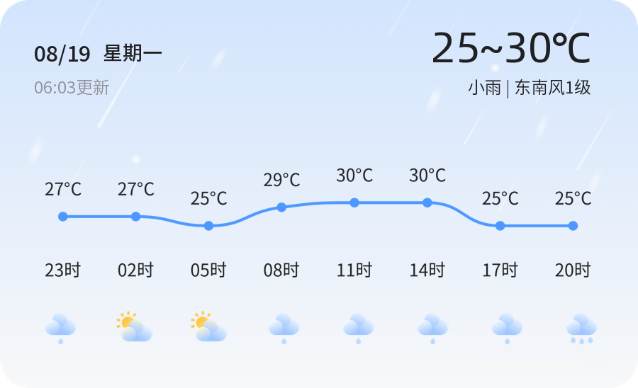 【今日天气概况】 今日为2024年8月19日,农历七月十六,潍坊迎来小雨天气,气温在25℃至30℃之间,东南风1级,空气湿度高达100%,PM2.5值为24,对应空气质量优,清新宜人。但小雨绵绵可能对市民出行造成不便,建议携带雨具,驾车出行注意路面湿滑。此外,黄色雷电预警已发布,请注意防范雷电及短时强降水。