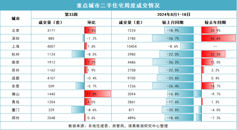 分城市来看,第33周有7城二手房成交量较上周上升,5城环比下跌。累计来看,截至18日,8月12个城市二手房成交量均不及上月同期;累计同比方面,8城上涨、3城下降。