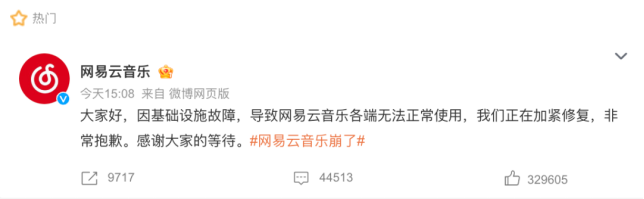 19日15时许,网易云音乐通过官方微博回应称:因基础设施故障,导致网易云音乐各端无法正常使用,我们正在加紧修复。