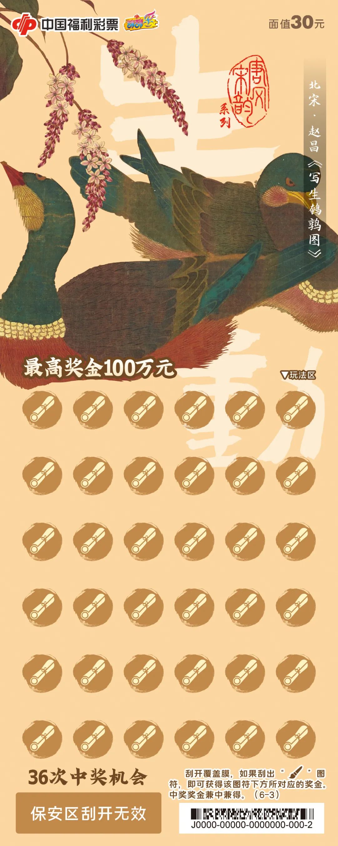 刮刮乐“唐风宋韵”将唐代画家韩干的《十六神骏图》、宋徽宗赵佶的《竹禽图》、北宋画家赵昌的《写生鹌鹑图》等唐宋时期的珍贵文物画作搬上票面,用传统的艺术元素结合现代的排版和设计手法,使票面既具有古典韵味又不失现代感,更充满了浓厚的历史文化气息。