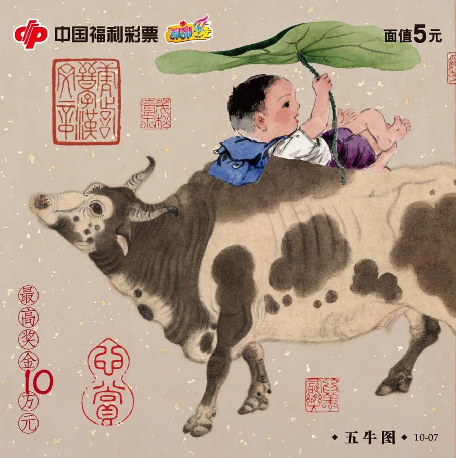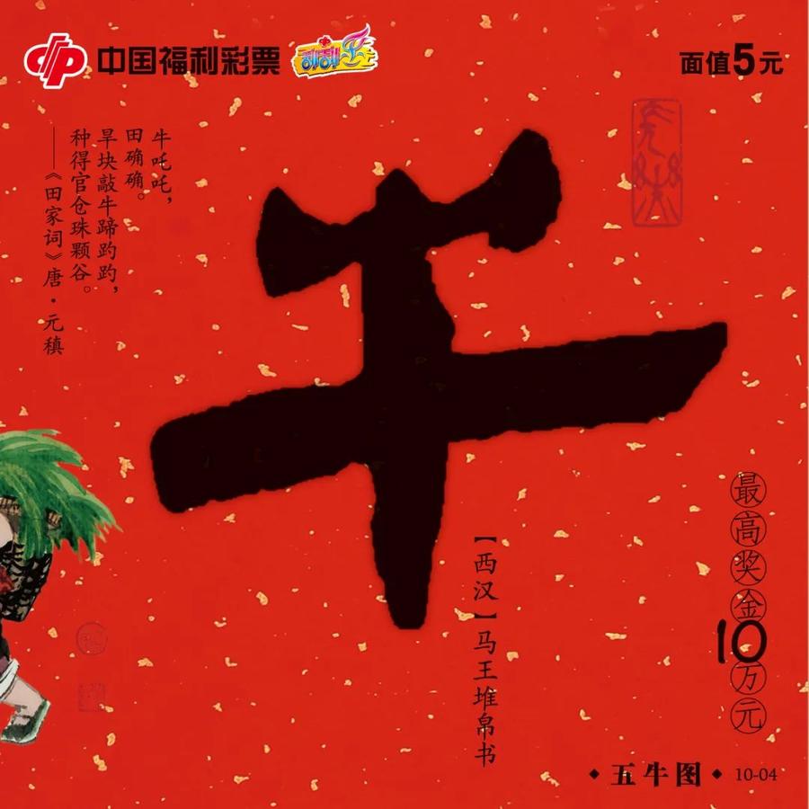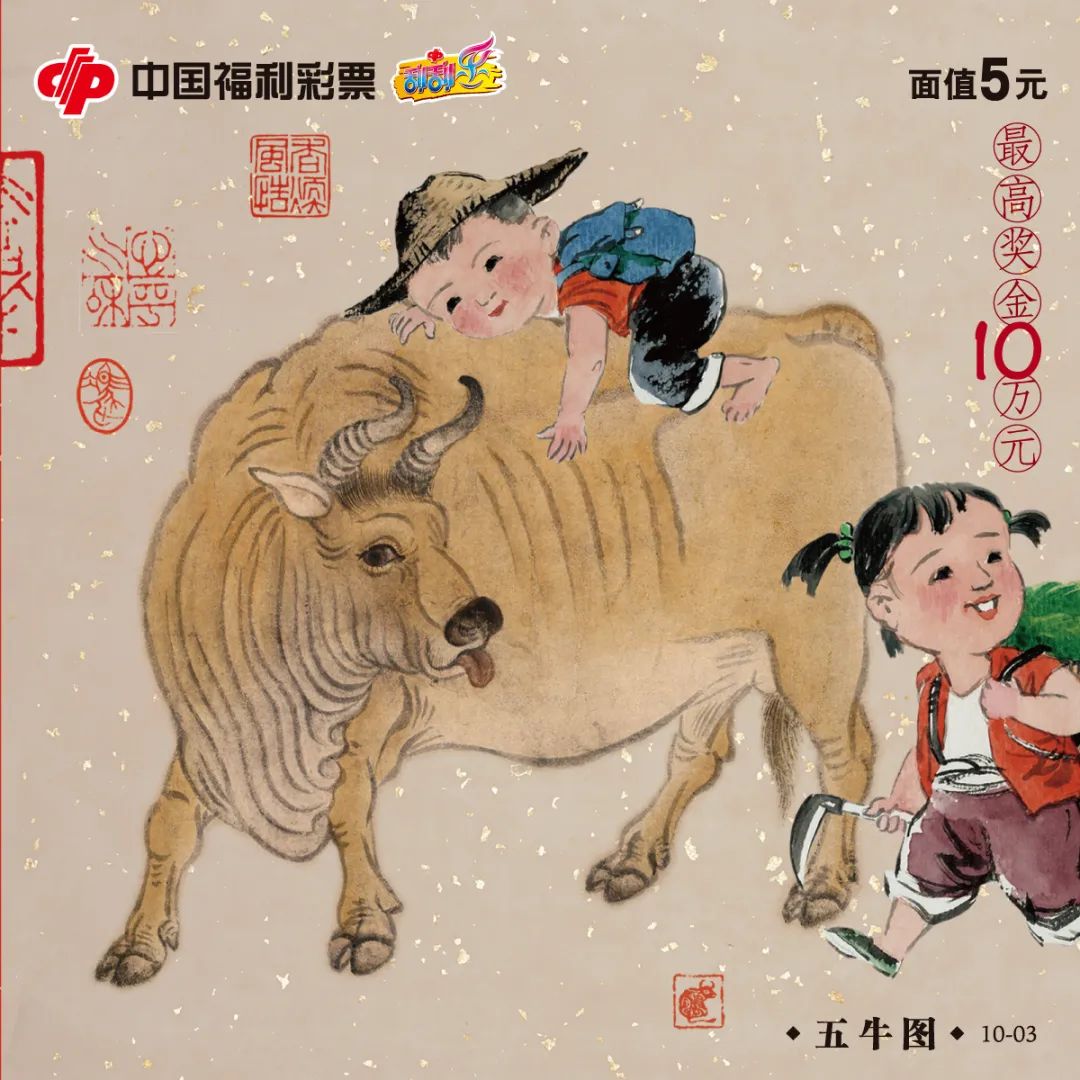 在中华民族的传统文化中,牛寓意事业兴旺,是财富和力量的象征。刮刮乐“五牛图”别出心裁地将这一稀世珍品搬上票面,结合颜真卿、苏轼、唐寅等历代书法名家的“牛”字,并配有黄庭坚、元稹等历代名人的“牛”诗、“牛”词,大大增加了票面的艺术性和观赏性。每幅票面上神态可掬的小牧童,更是增添了浓浓的生活气息,带有几分喜庆色彩和幸福吉祥的寓意。