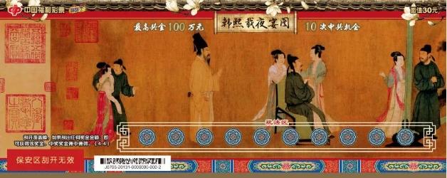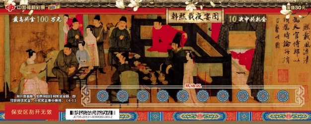 刮刮乐“韩熙载夜宴图”以此为主题,整套票面以古香古色的宫墙、色彩斑斓的琉璃和优雅绽放的玉兰为背景,将这场宏大的韩府夜宴完整地展现在购彩者面前。
