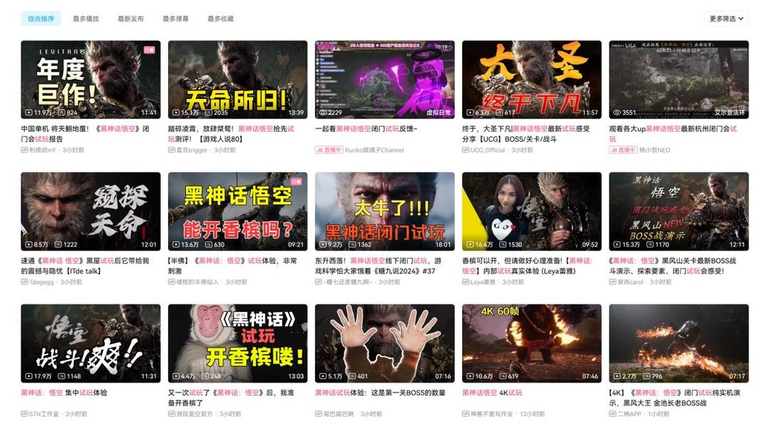 《黑神话:悟空》并非如今才火的,而是一直自带话题流量。2020年8月20日,游戏科学公布了《黑神话:悟空》的第一个13分钟实机操作视频。在发布两小时后,该视频就登顶B站热门榜首,吸引了超6万名同时在线观众,在一天之内播放量突破了700万次,弹幕数量超11.4万。2023年,《黑神话:悟空》在德国科隆游戏展展出,试玩排队时间长达数个小时,部分海外玩家接受采访表示,愿意坚持排队5小时,只为体验这款中国游戏。