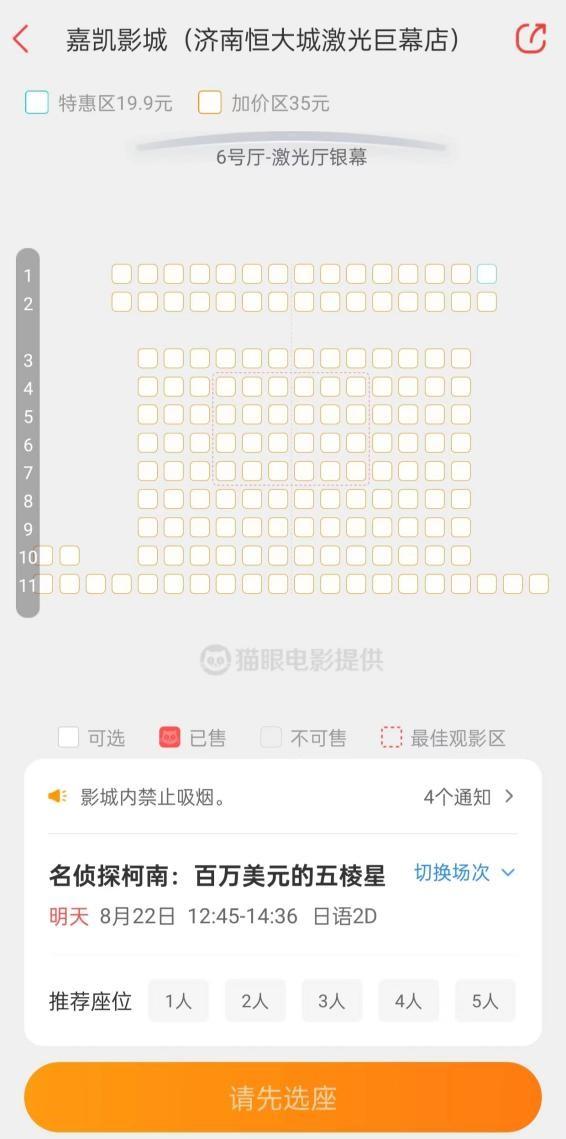 然而进入选座的页面后才发现,能容纳150多人的影厅里,竟只有1个位置是19.9元的特惠区域,且位置偏僻,位于第一排最右边的角落。除这个位置以外,其他区域均为价格35元的加价区,和特惠区域相比,同场次票价相差15.1元,差价近1倍。