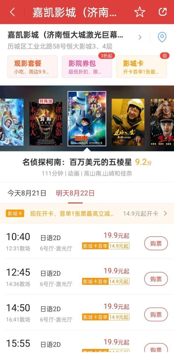 以嘉凯影城(济南恒大城激光巨幕店)为例,猫眼平台显示该影院8月22日上映的电影《名侦探柯南:百万美元的五棱星》,票价均为19.9元起,用影城卡首单购买则享受更低的价格,14.9元起。