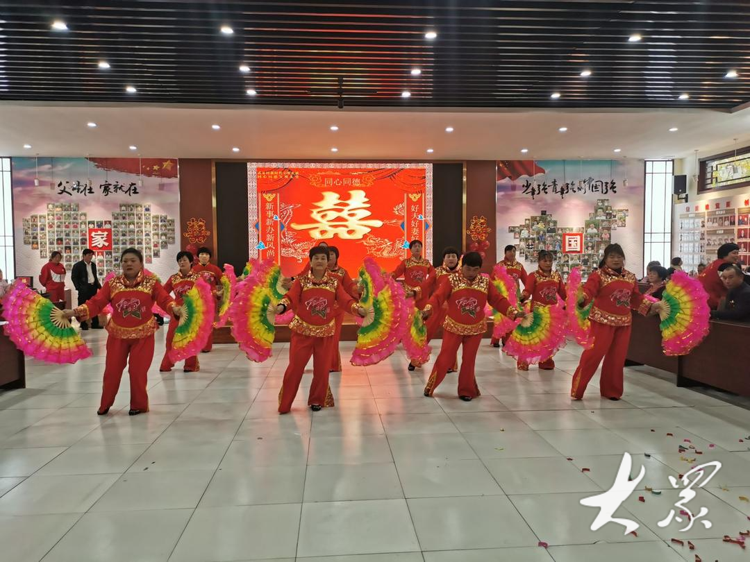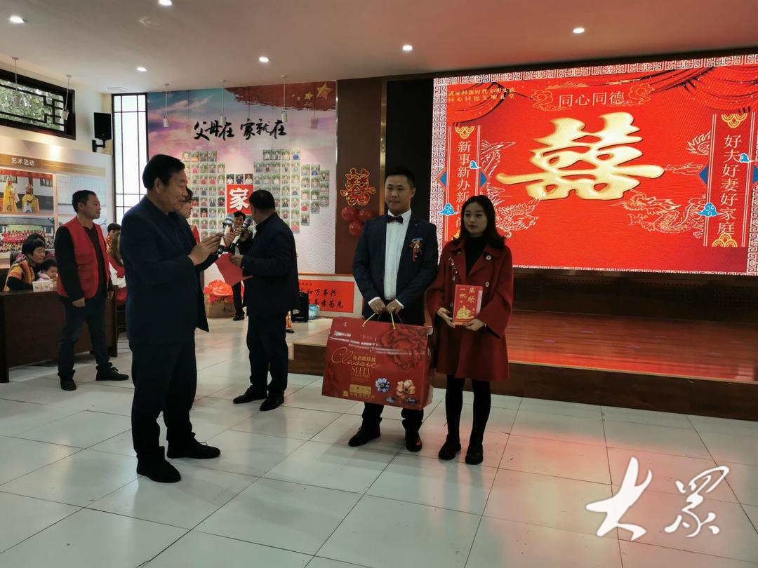 2019年,武家村打造了集政策宣讲、文化演出、婚庆典礼等功能于一体的新时代文明礼堂,为新人免费提供结婚场地。同时,推出登喜堂、拜天地、揭盖头、合卺礼等“新婚九礼”,整个过程由村书记主持进行。