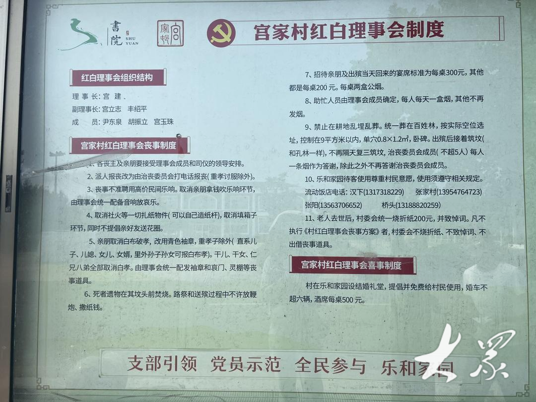同时,宫家村白事制度取消社火等一切扎纸物件,由理事会统一配发袖章和哀门、灵棚等丧事道具。粗略一算,道具能节省1000元,社火节省约700元,酒席餐标每桌不能超过300元,且全部是大碗菜,相比以前,也能省下不少钱。