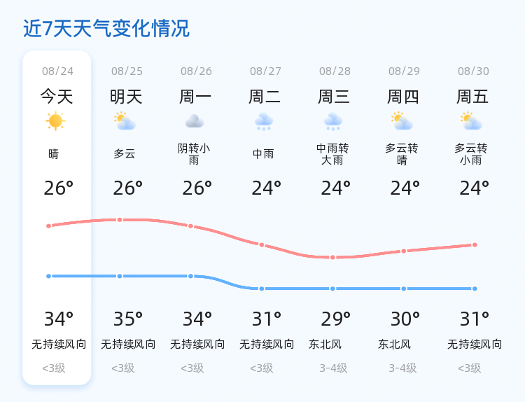 展望未来三天,枣庄的天气将逐渐转为阴雨模式。周一将迎来阴转小雨的天气,最高气温维持在34℃左右,周二则可能出现中雨,气温略有下降,最低降至24℃,最高不超过31℃。而周三,雨势可能进一步增强,由中雨转为大雨,并伴有东北风3-4级,市民需密切关注天气预报,做好防雨防风准备。周四起,雨势减弱,但多云转晴后,气温依然偏低,保持在30℃左右。