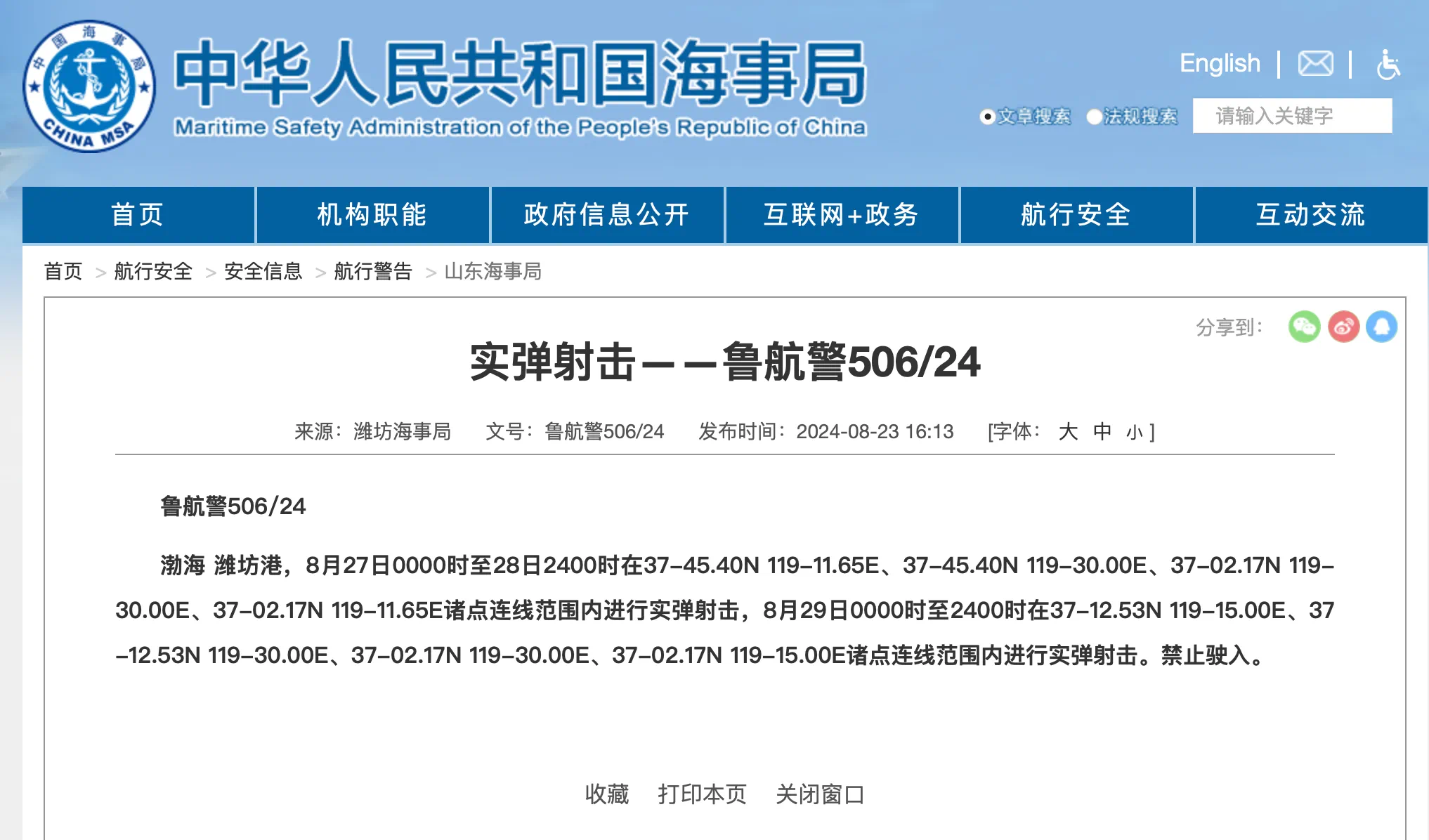 潍坊海事局通知:实弹射击 禁止驶入!