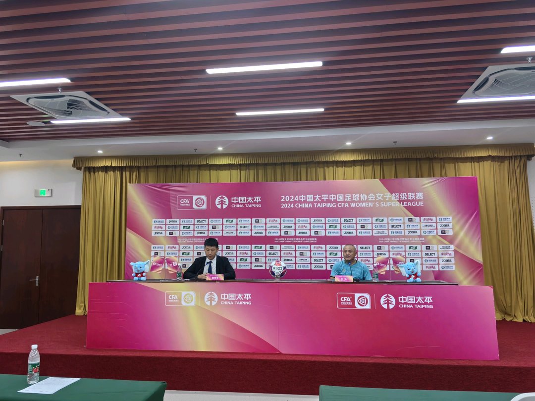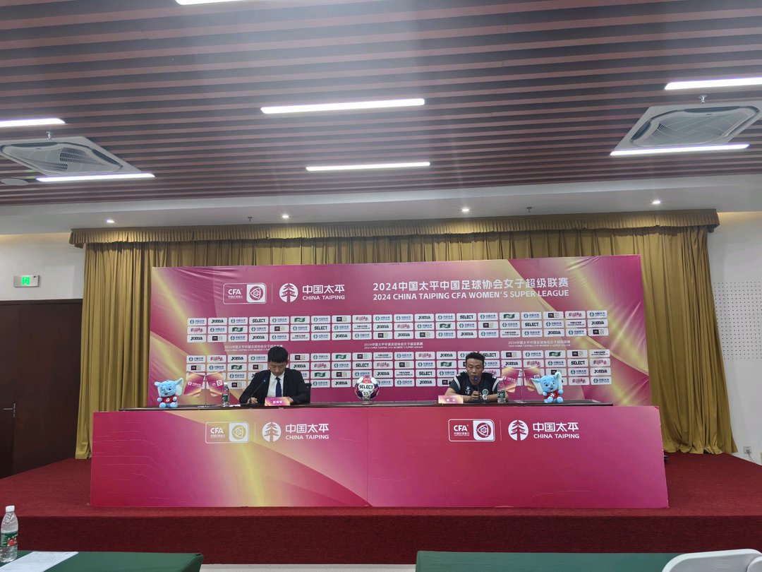 赛后新闻发布会环节,海南农信琼中女足主教练梁斌,山东体彩女足主教练崔勇出席并接受记者提问。