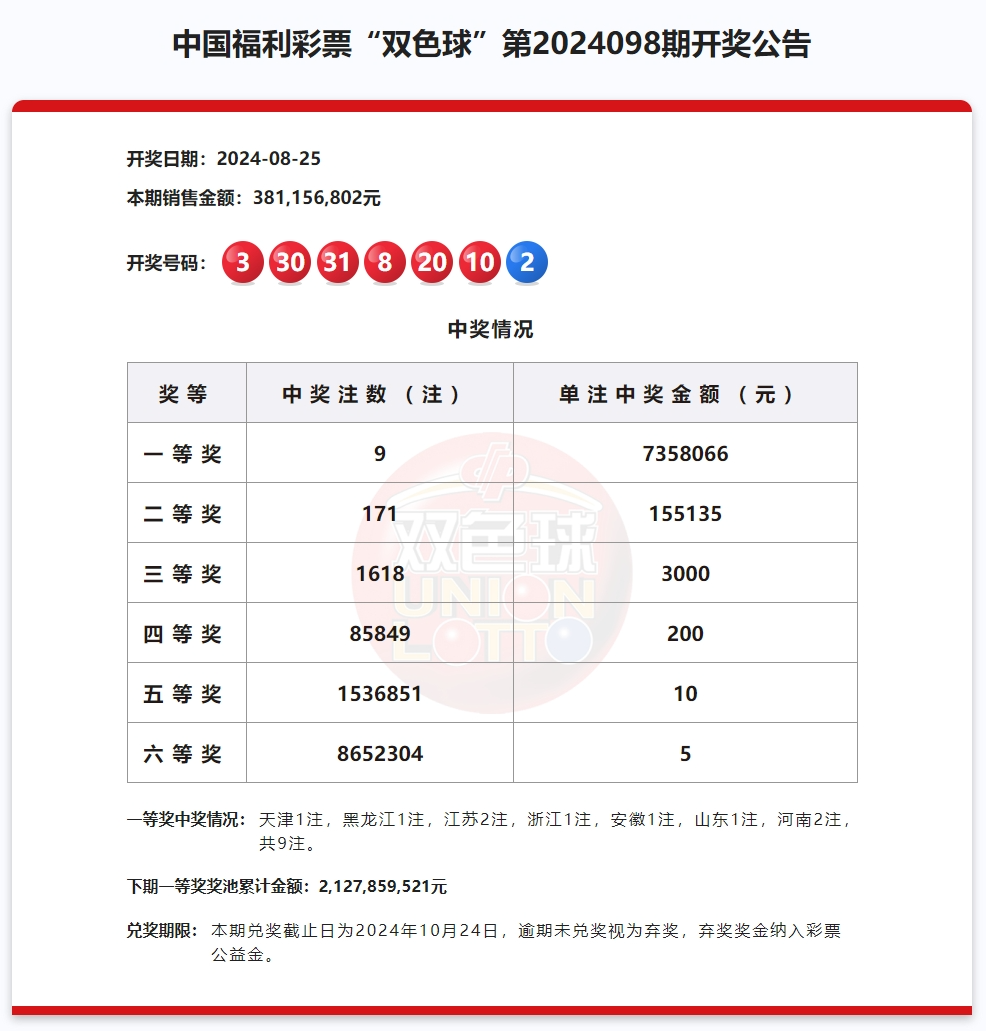 双色球2024098期中出一等奖9注筹集公益金约1.37亿元
