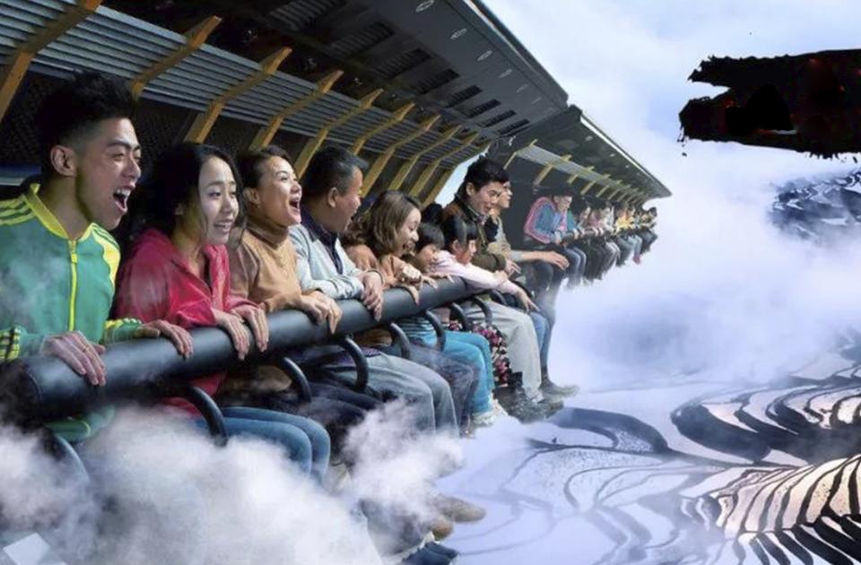 游客体验孙子文化园大型游乐设备球幕影院