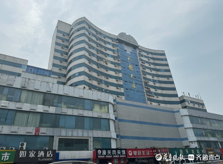 正值暑假,不少外地游客乘坐火车前来济南游玩,出站口的打车区排起长队。从济南站出站口顺扶梯而上,迎面看到的一栋蓝白相间的十几层建筑,便是天龙大厦。大厦外侧墙皮开始脱落,不少电线和空调外机裸露在外,蓝色的玻璃窗看上去已有些年头。