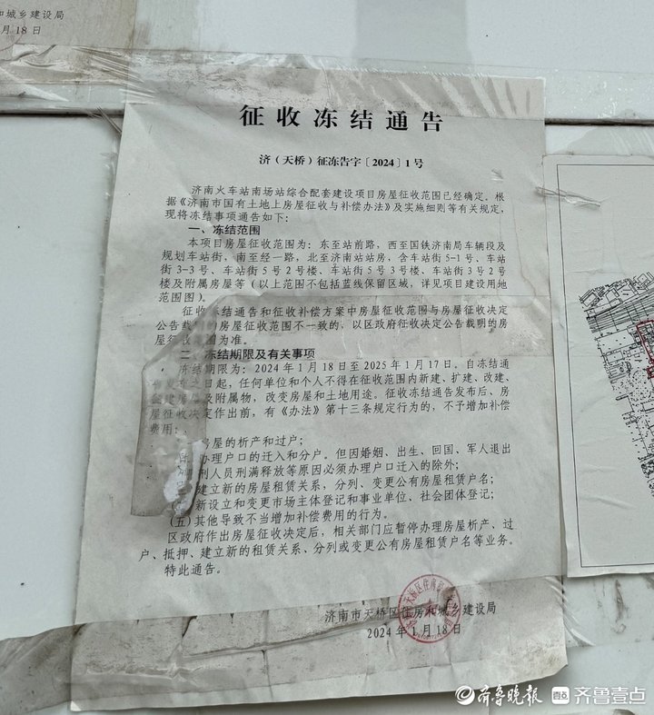 在天龙大厦东侧外墙贴有济南市天桥区住房和城乡建设局于2024年1月18日下发的“征收冻结通告”。通告中显示,济南火车站南场站综合配套建设项目房屋征收范围为,东至站前路,西至国铁济南局车辆段及规划车站街,南至经一路,北至济南站站房等。从公布的征收范围来看,天龙大厦在此次征收冻结范围内。